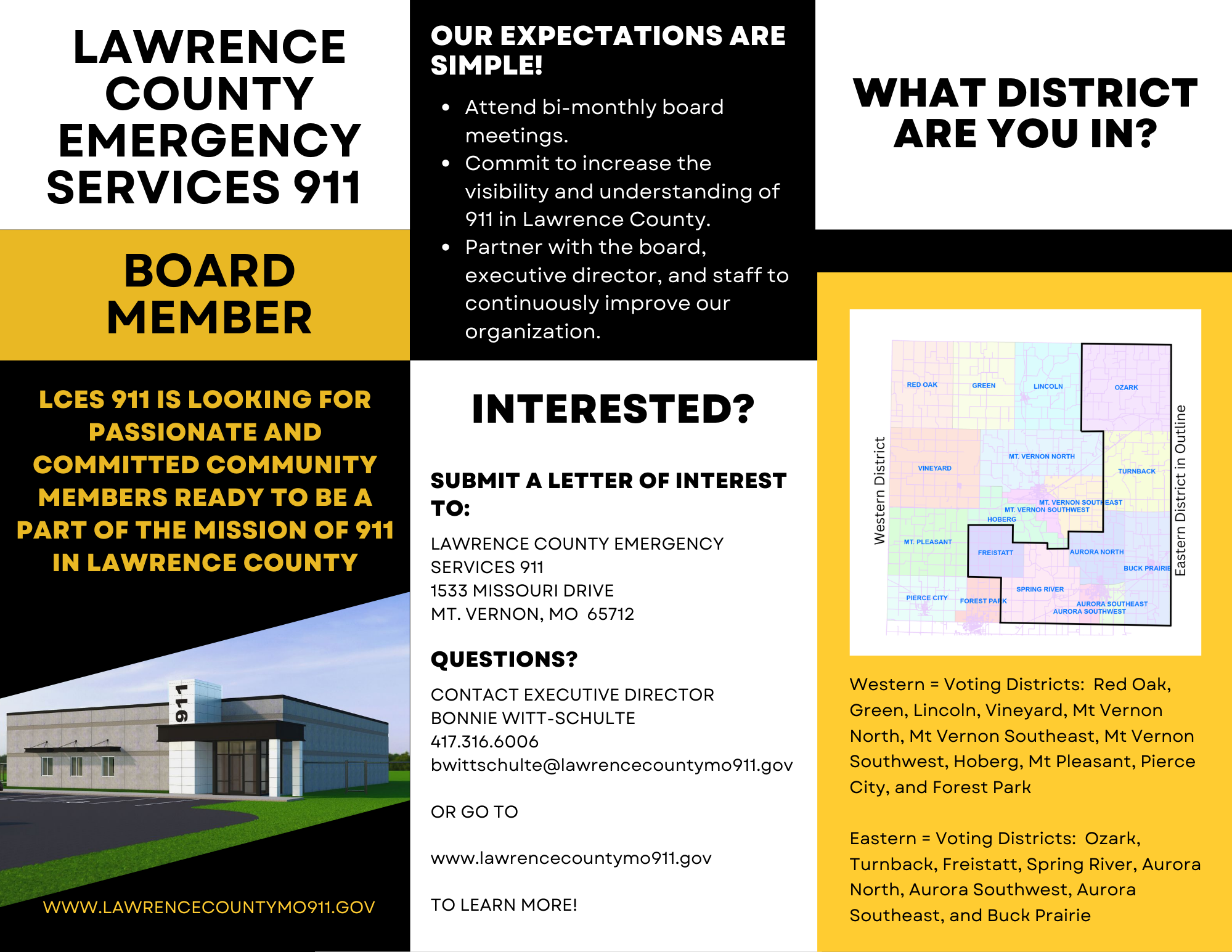 "Letters of Interest" will be accepted until March 10, 2026, at 5:00 PM. Questions can be directed to Executive Director Bonnie Witt-Schulte via phone at 417-316-6006 or via email to bwittschulte@lawrencecountymo911.gov.